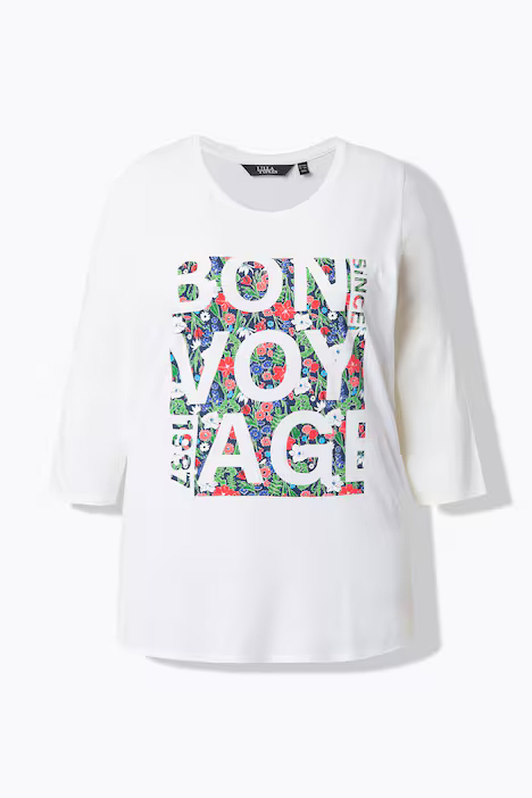 Since white is such a fresh and versatile base, it pairs effortlessly with everything already in your wardrobe. However, the “Bon Voyage” floral motif adds just enough colour and detail to lift the look. You can wear it with jeans for a relaxed daytime feel, or you can style it with trousers for something a little more polished. So, it adapts easily to whatever you have planned.