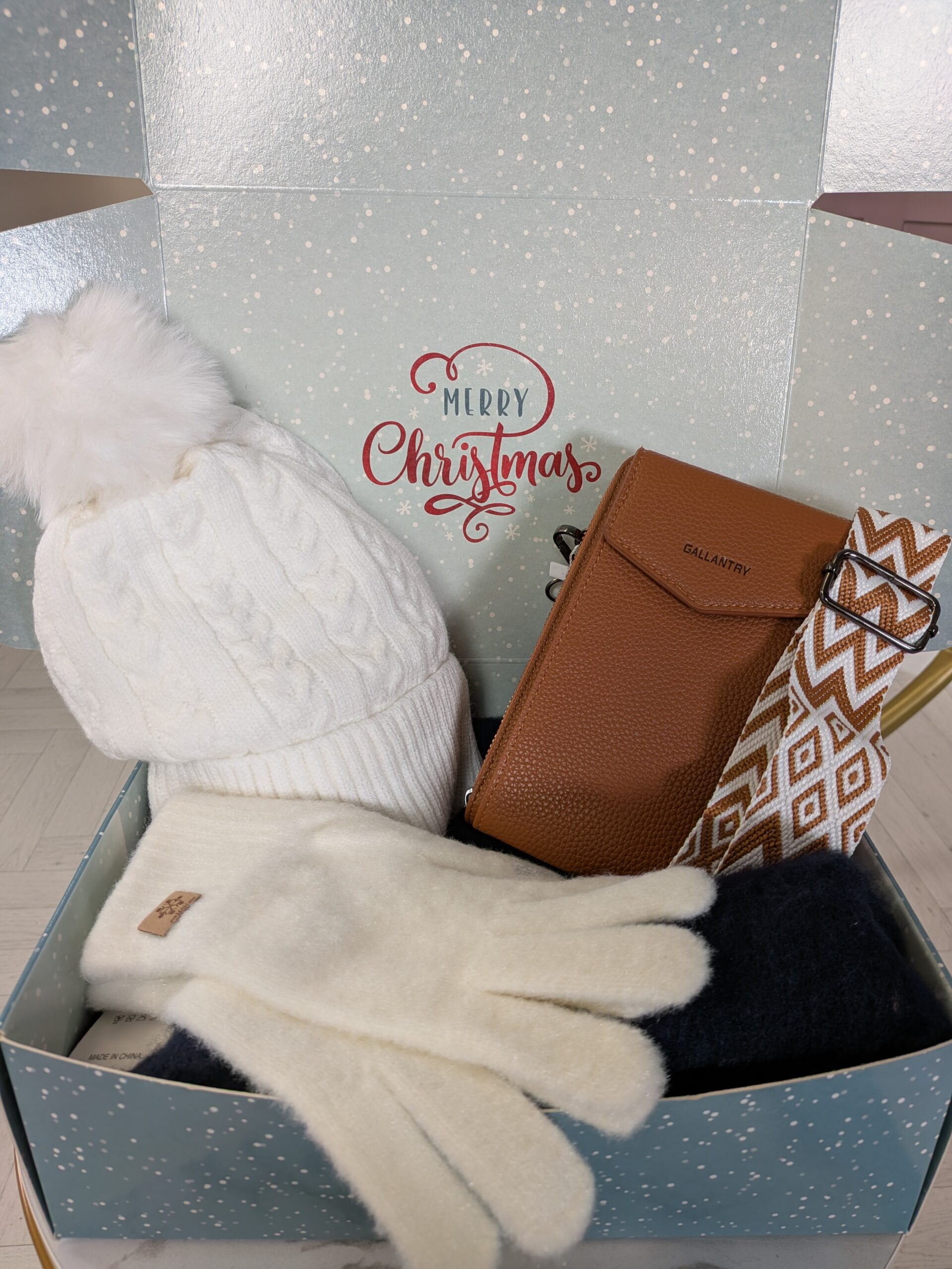 The Christmas Gift Box (Cream) is made for anyone who loves soft textures, cosy layers and thoughtful accessories. Inside the festive Merry Christmas box, you’ll find a plush cream cable-knit bobble hat, matching soft-touch gloves, a fluffy navy scarf, a tan crossbody-style phone purse and a patterned wrist strap for keys or cards. Because everything coordinates without being overly matchy, it creates a polished winter set that feels both warm and stylish. Since the colours blend cream, tan and navy, the pieces also suit a wide range of winter outfits.