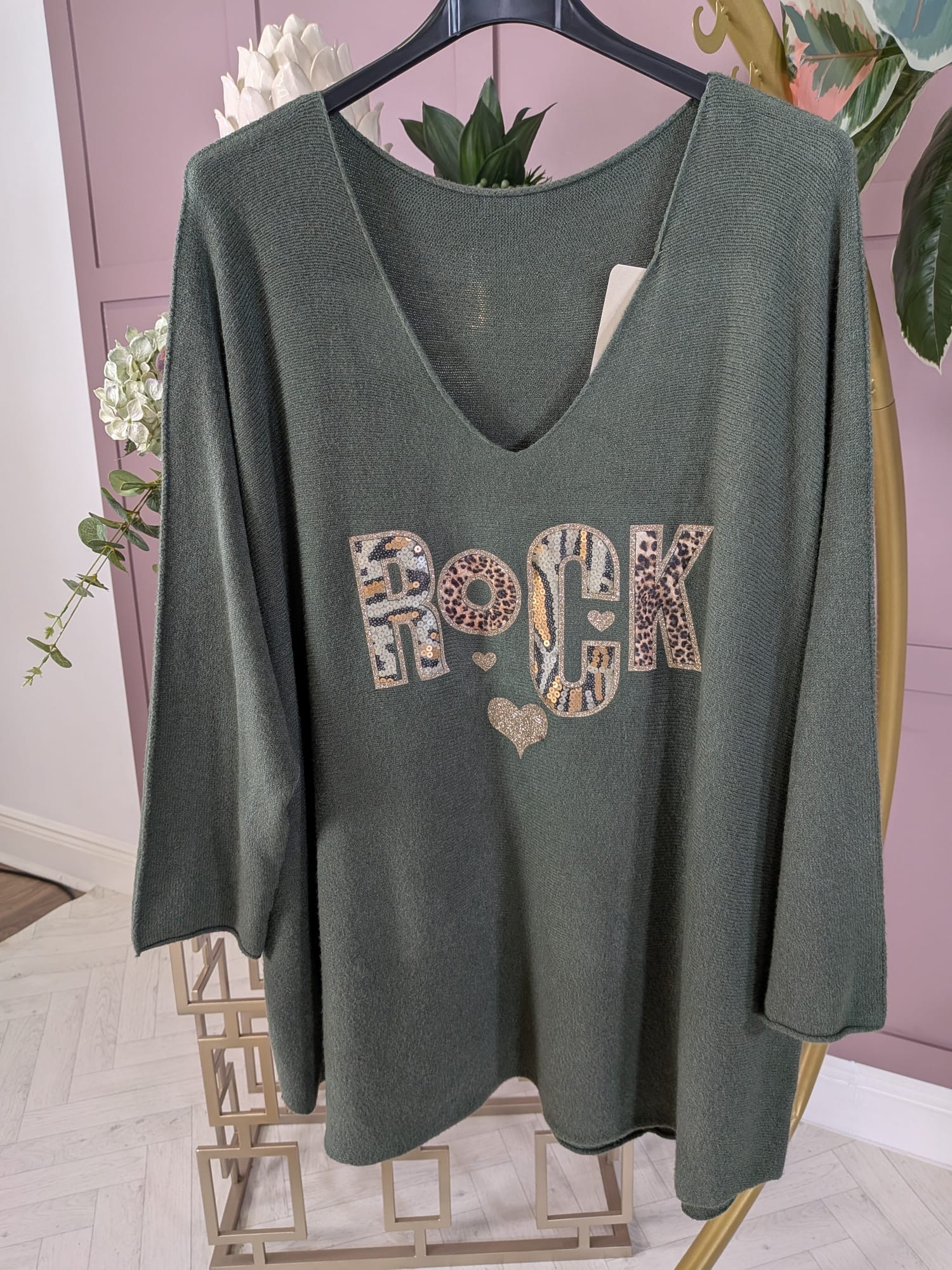 Khaki Rock Knitted Jumper – khaki green knit with V-neck, ¾ sleeves, dropped shoulders, and sequined ROCK motif with animal-print sparkle.