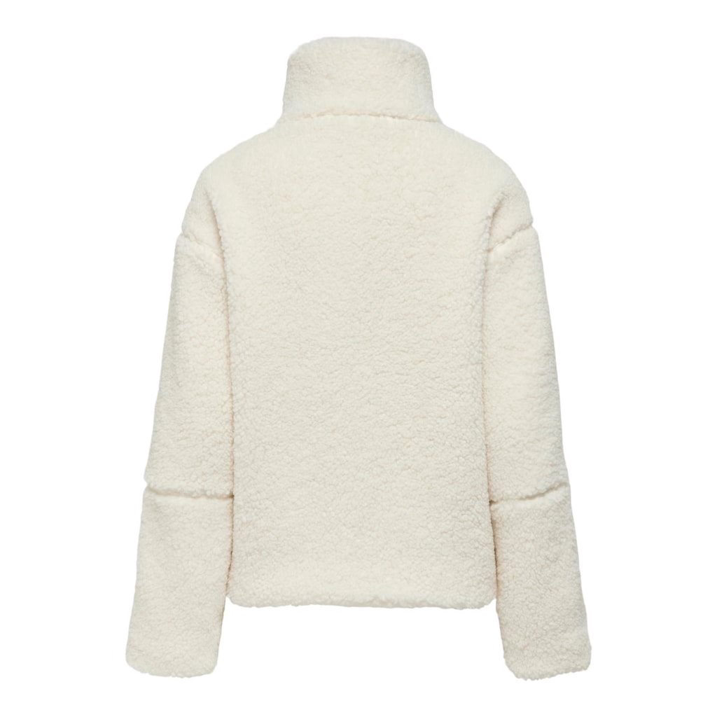 ONLY Caraspen Teddy Jacket – cream zip-up recycled polyester teddy coat with high collar and relaxed fit.