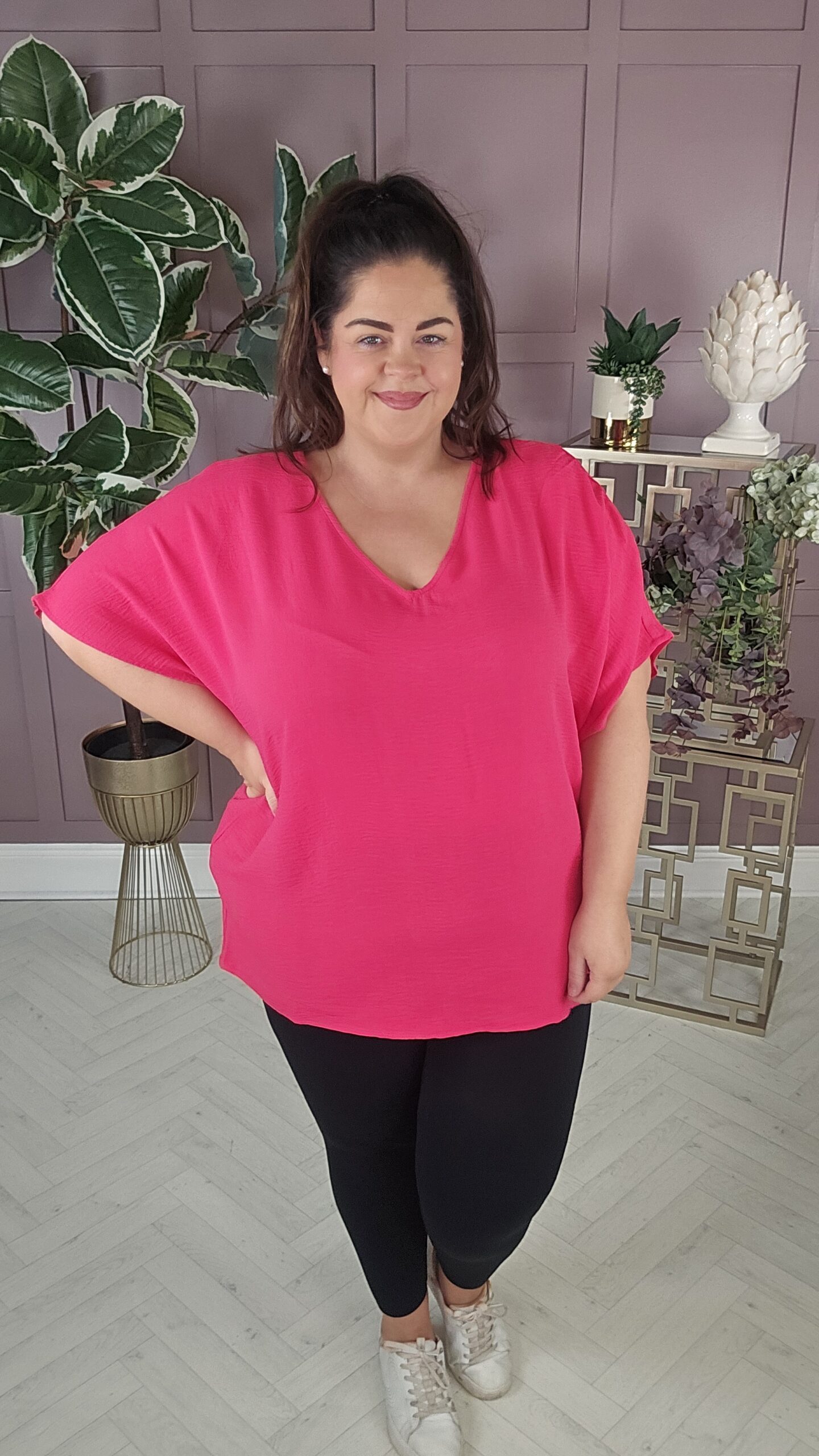 The V-neck creates a flattering neckline that feels comfortable and easy. Although the fit is regular, the dropped shoulders give the top a relaxed drape that sits nicely on the body. Since the short sleeves offer soft coverage, the shape feels balanced and flattering. Meanwhile, the button closure at the back of the neck adds a subtle detail that keeps the finish neat.