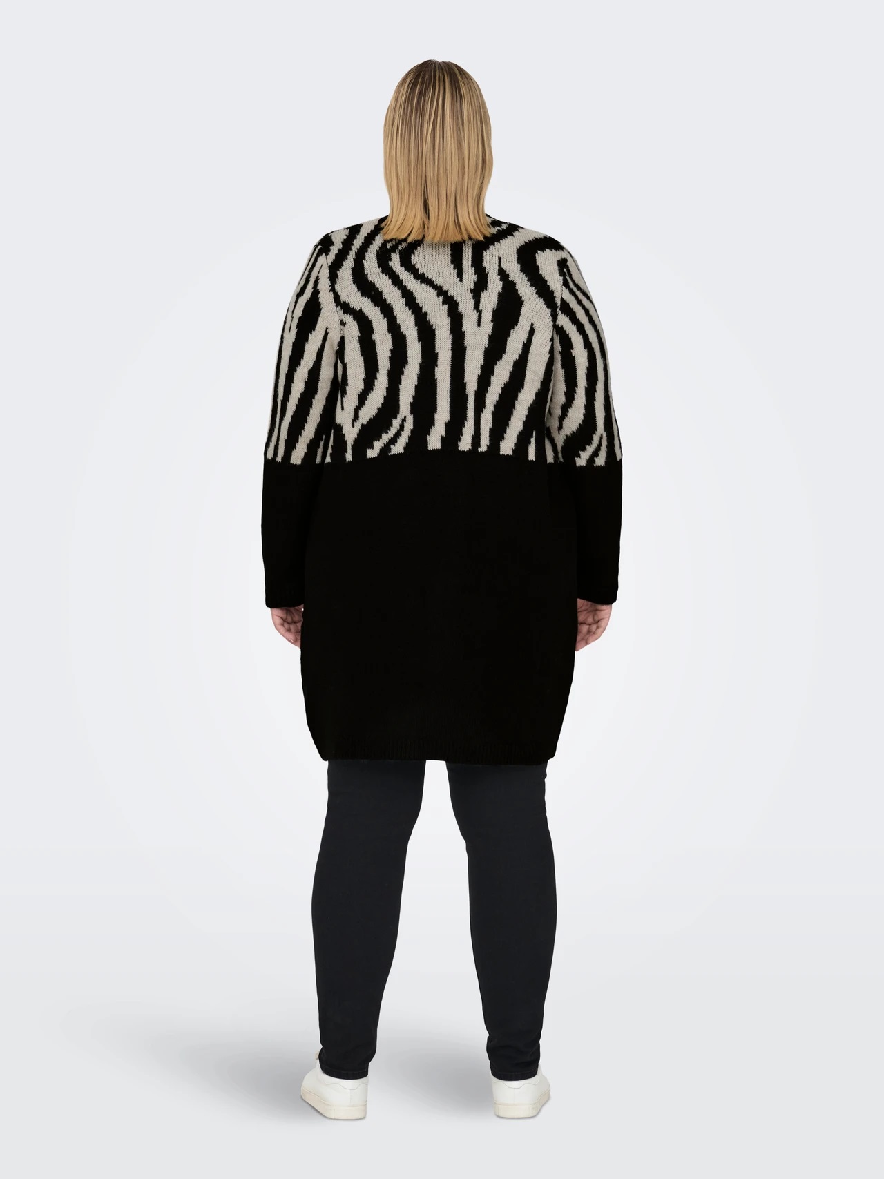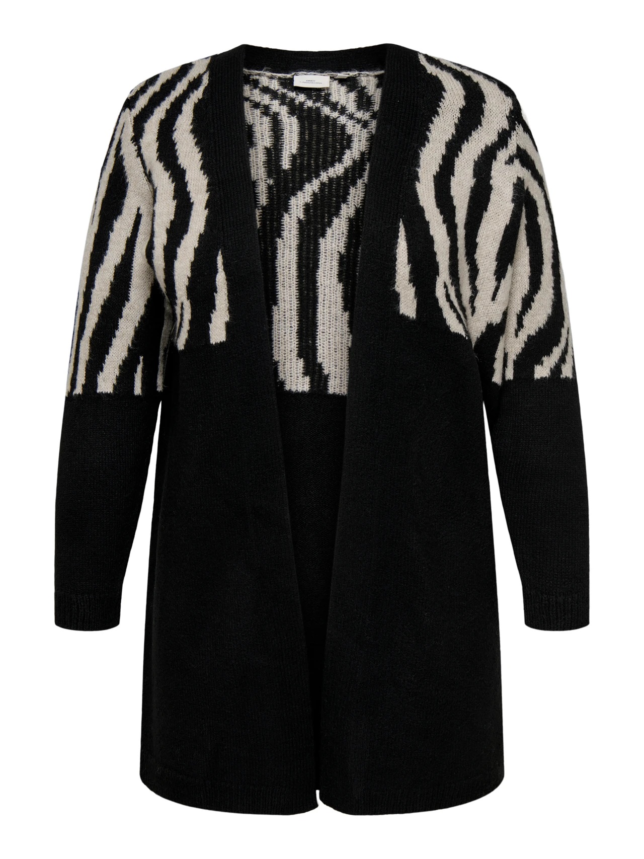 Striking and versatile 🖤 The ONLY Knitted Cardigan (Black) features a longline fit, zebra print, and open front for bold curvy layering.