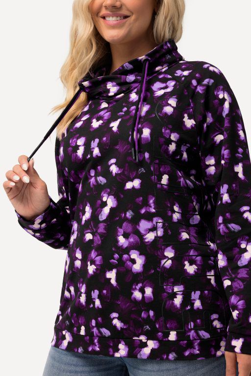 Ulla Popken Floral Print Drawstring Collar Cowl Neck Sweater