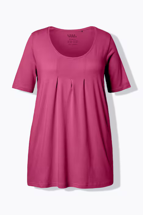 The front inverted pleats create beautiful movement through the fabric. Because these pleats add space across the tummy and hips, the tee skims over curves instead of clinging. As a result, the fit feels forgiving and relaxed while still looking neat and put together. Although the shape feels easy, it never looks oversized or shapeless.