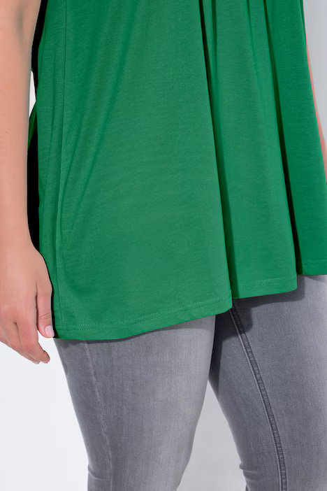 The front inverted pleats add shape without bulk. Because these pleats create extra space through the midsection, the fabric glides over curves instead of clinging. As a result, the top feels airy and forgiving while still looking tidy and put together. Although the fit feels relaxed, it never looks oversized or shapeless.