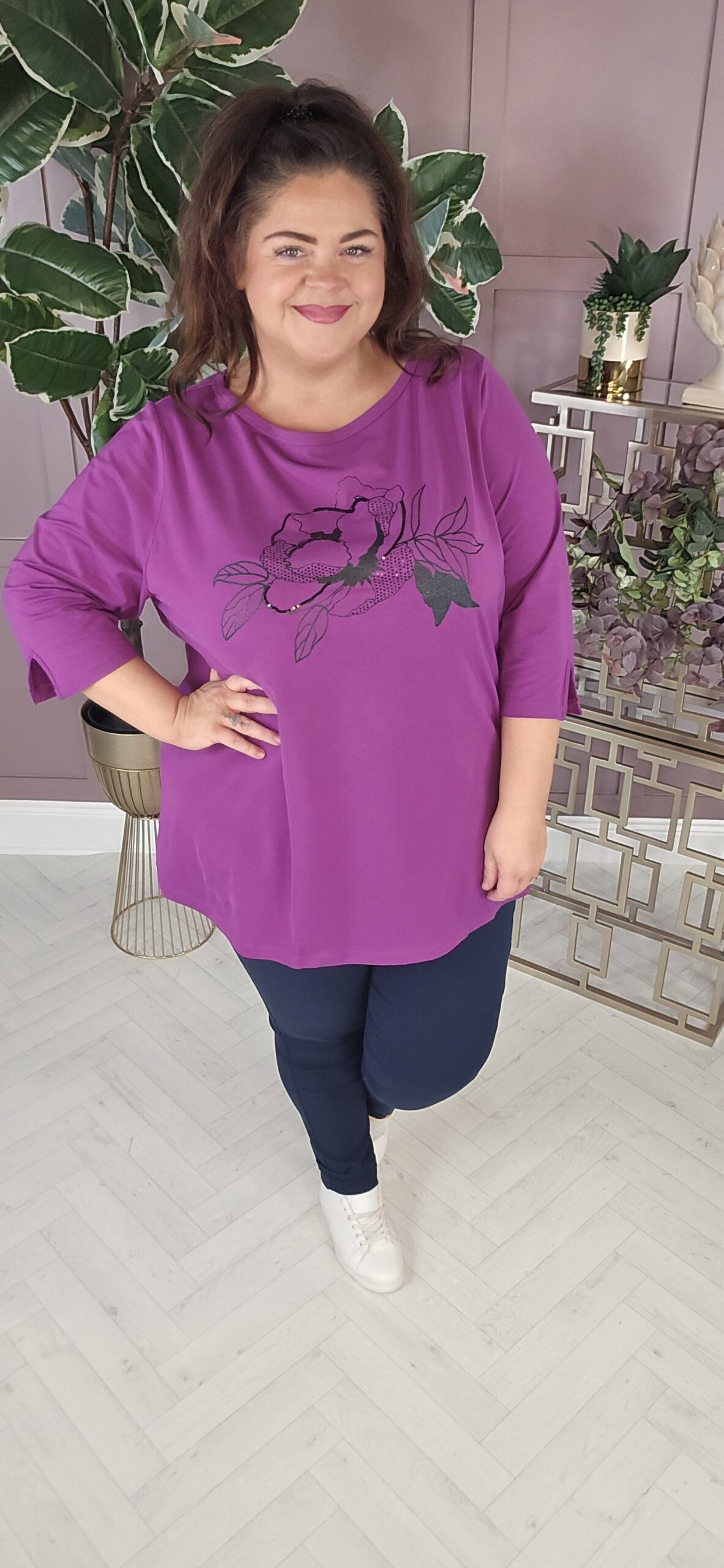 Add a touch of sparkle with the UllaPopken Flower Motif Tee in blackberry — casual comfort meets elegant detail.