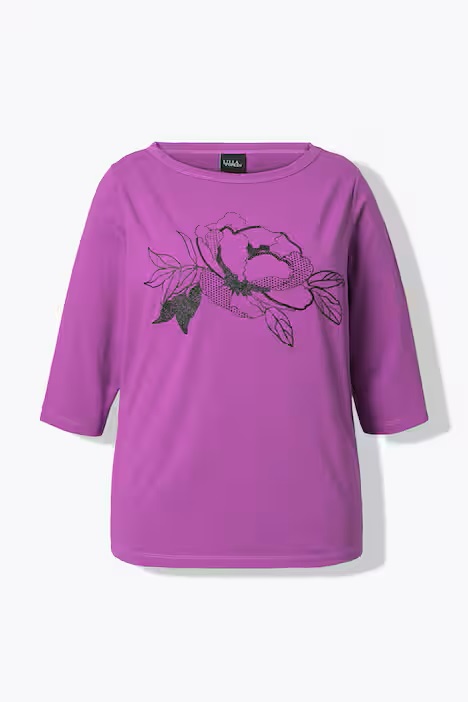 This tee balances subtle shimmer with everyday ease. The blackberry tone feels rich and versatile, while the rhinestone-and-sequin flower motif adds a gentle glow rather than an overpowering shine. Moreover, the boat neckline frames the collarbone neatly, and the 3/4 sleeves with small slits lend a light, feminine finish. Because the cut skims rather than clings, it creates a smooth line that works with denim, trousers, or skirts. In addition, the length sits comfortably at the hip, so it looks polished whether worn loose or lightly tucked.