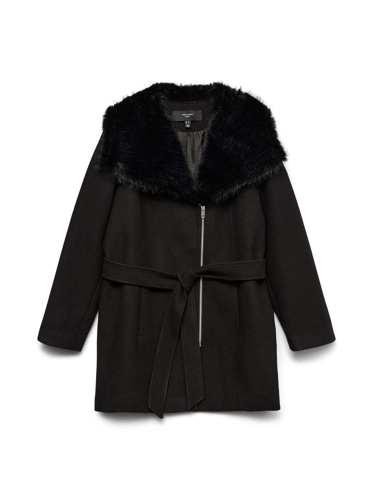 VeroModa Autumn Betty Coat in black with faux fur collar, belt and zip fastening, and side pockets.