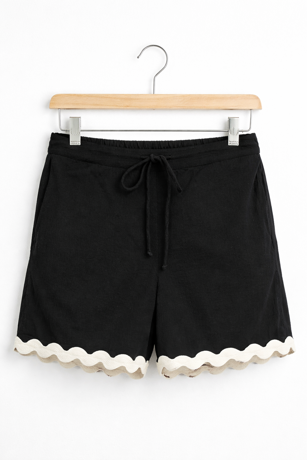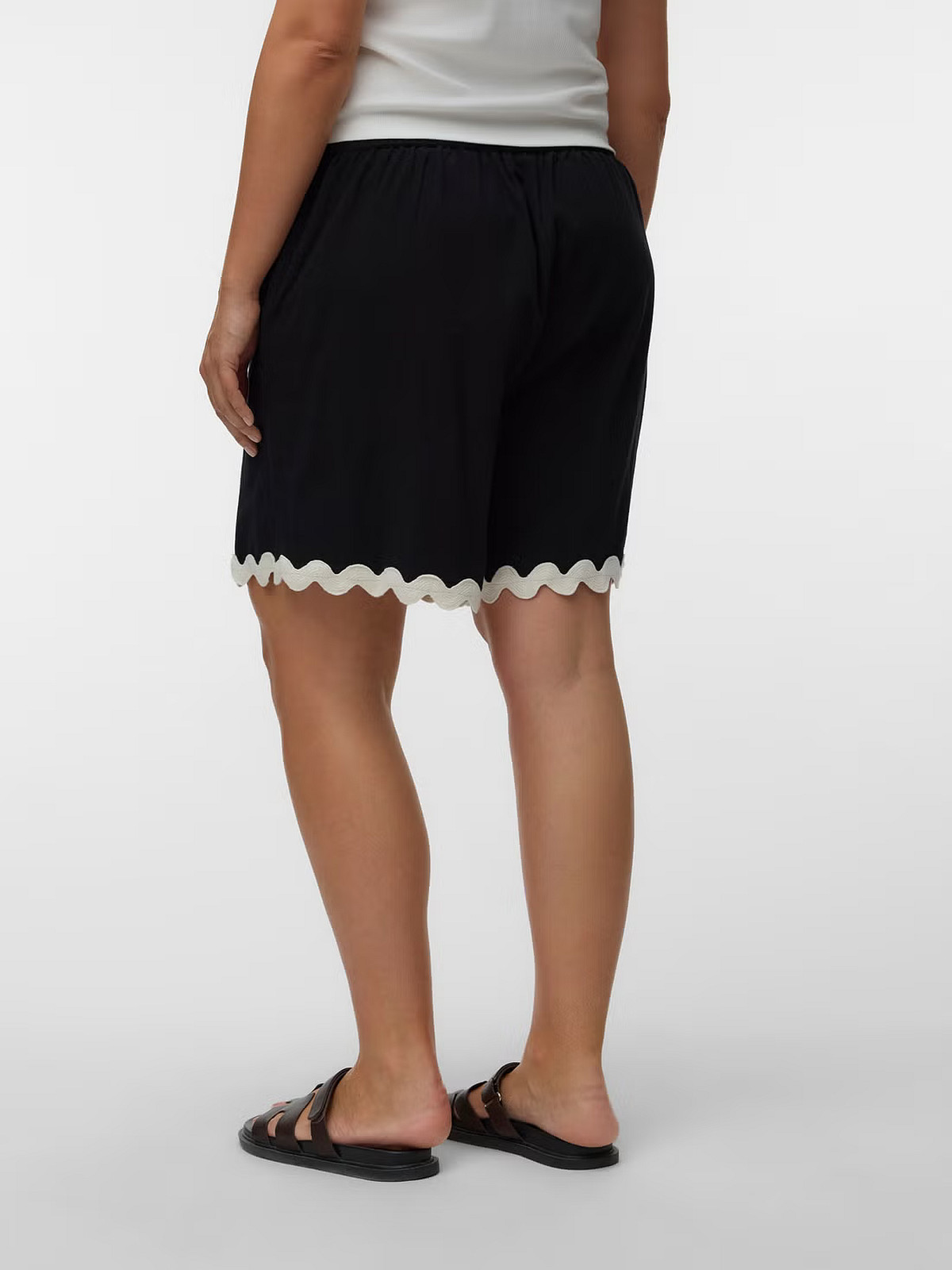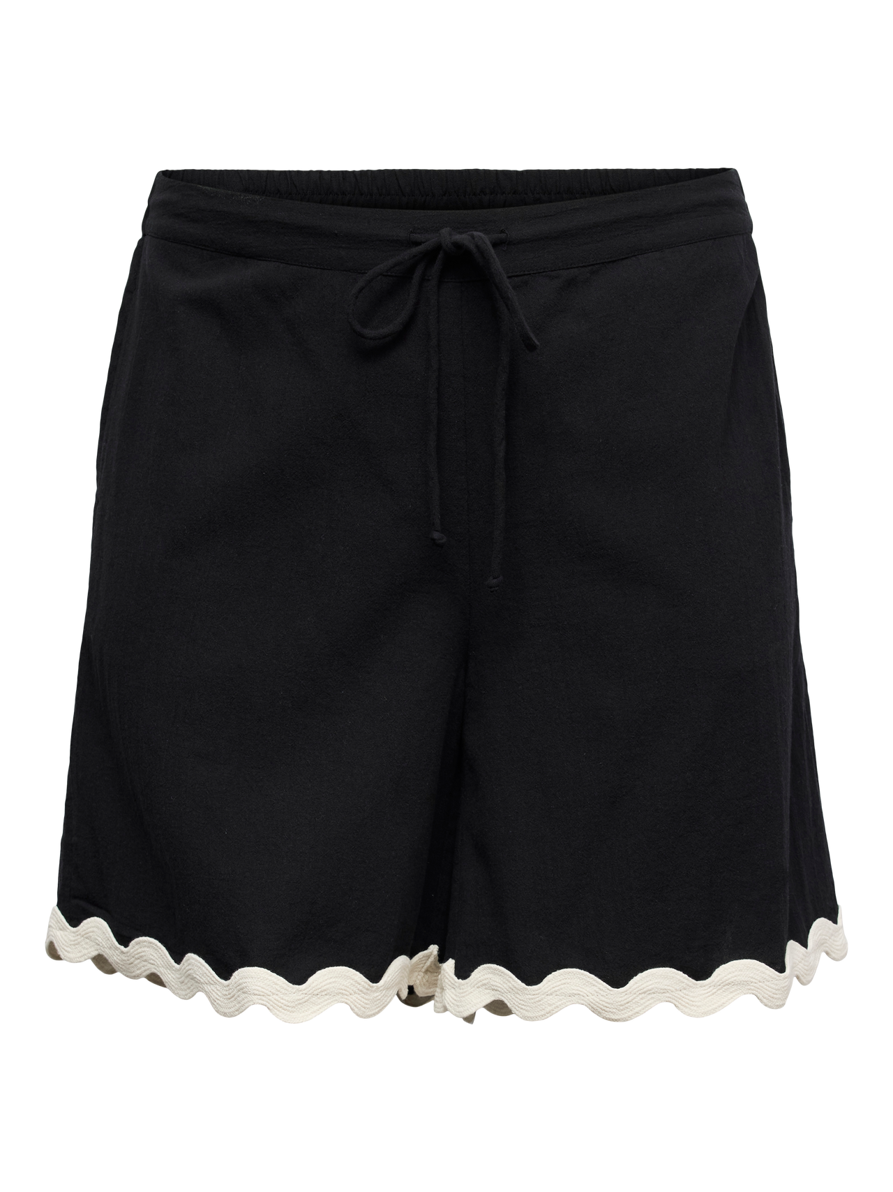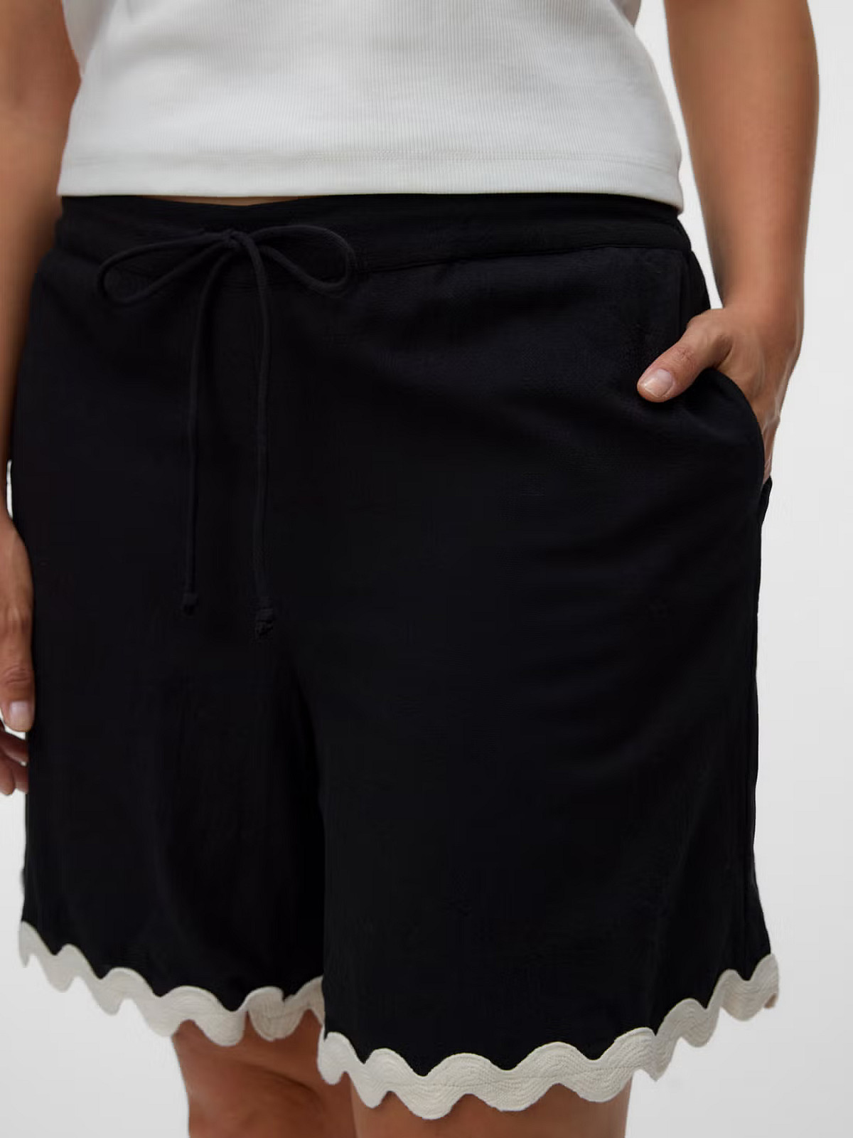 VeroModa black scalloped shorts with tie waist, contrast trim, and soft cotton fabric
