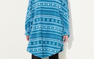 Ulla Popken Alpine Striped Plush Poncho with asymmetric collar, dropped shoulders, and cozy drape. Made from 95% recycled polyester and