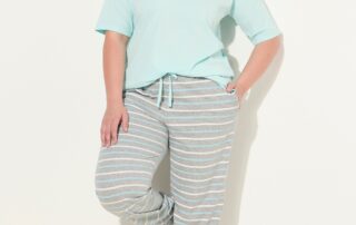 Fresh, fun, and comfy – this Ulla Popken striped heart pajama set with mint v-neck tee and striped pants makes