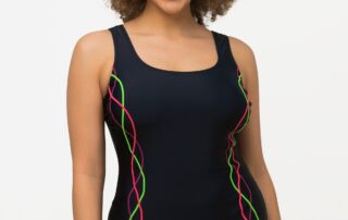 Sporty navy one-piece with plunging backline, wide straps, and colourful braided piping—supportive, flattering, and eco-conscious plus size swimwear.
