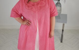 Ulla Popken’s layered cotton dress features a lace neckline, cold-dyed top layer, and split hem—perfectly modern femininity in plus size