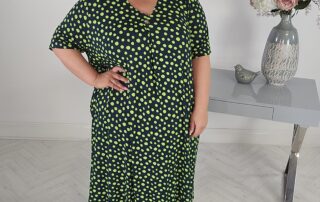 plus size dresses Ulla Popken Polka Dot Short Sleeve V-Neck Dress v-neck navy with lime green polka dots short sleeves