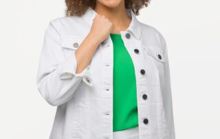 plus size jackets Ulla Popken White Denim Jacket spread collar two breast pockets long sleeves button closure 57% cotton, 29%